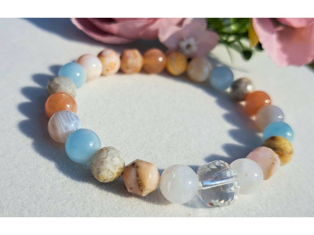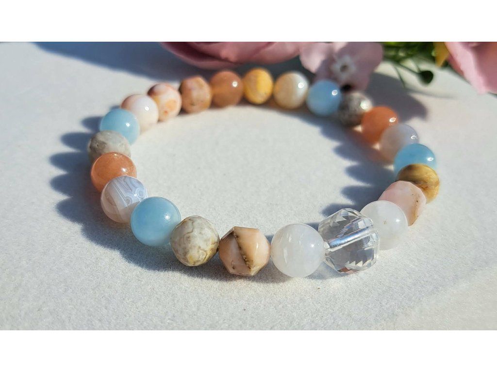 "Homok és ég" karkötő, rózsaopál, achát, holdkő, akvamarin, kb. 8 mm-es ásványkövekből, egy kb. 10 mm-es fazettált hegyikristály szemmel