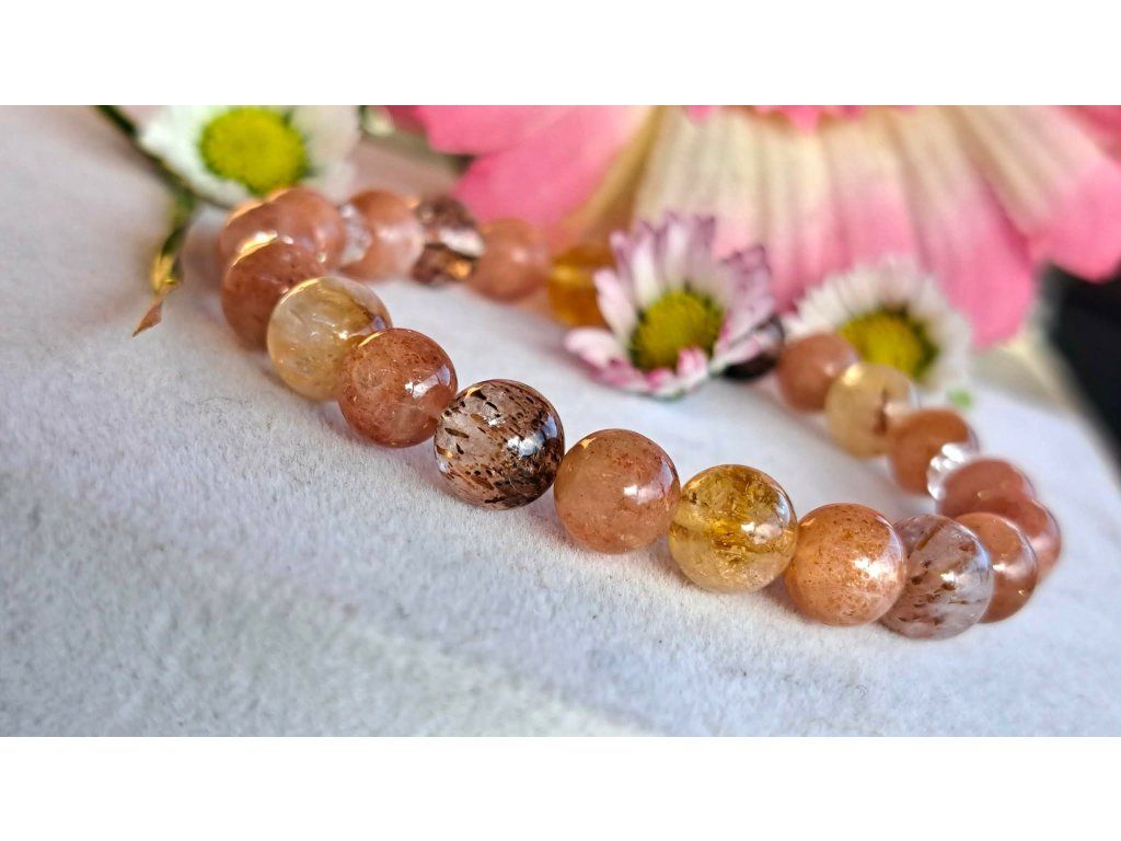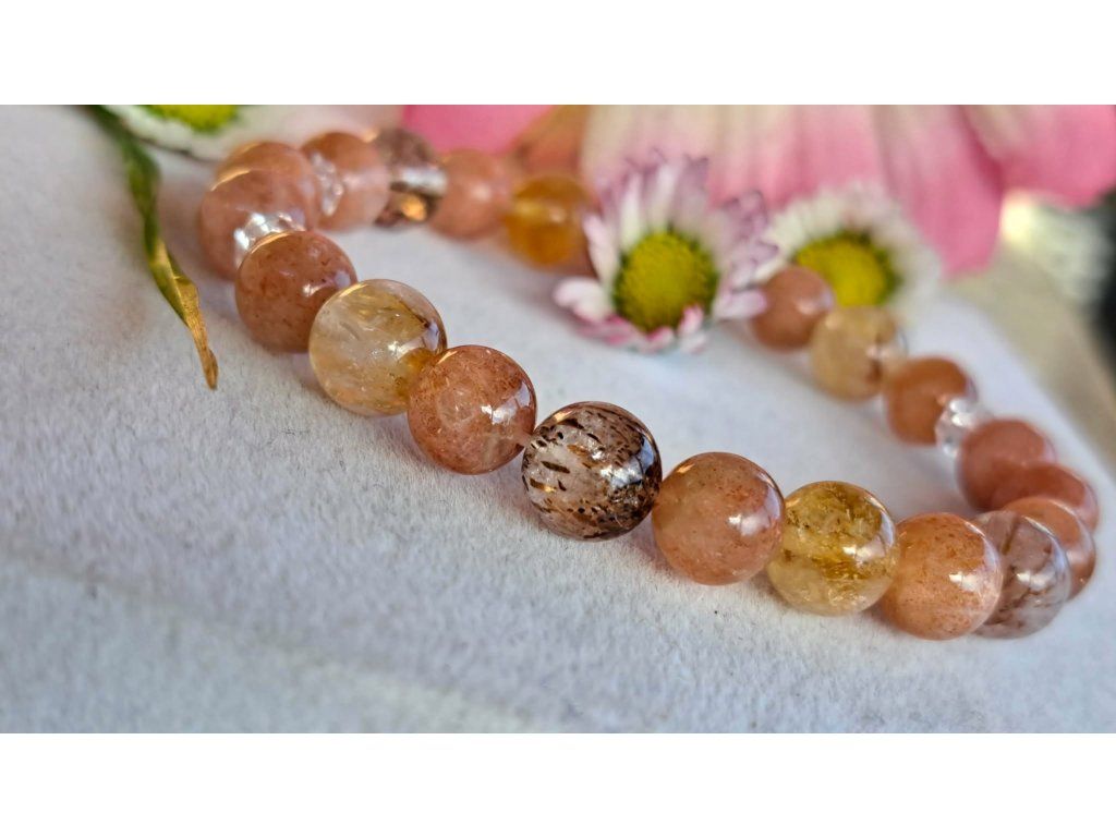 "Napmosoly" karkötő prémium napkő, citrin és rutilos kvarc, kb. 8 mm-es golyók