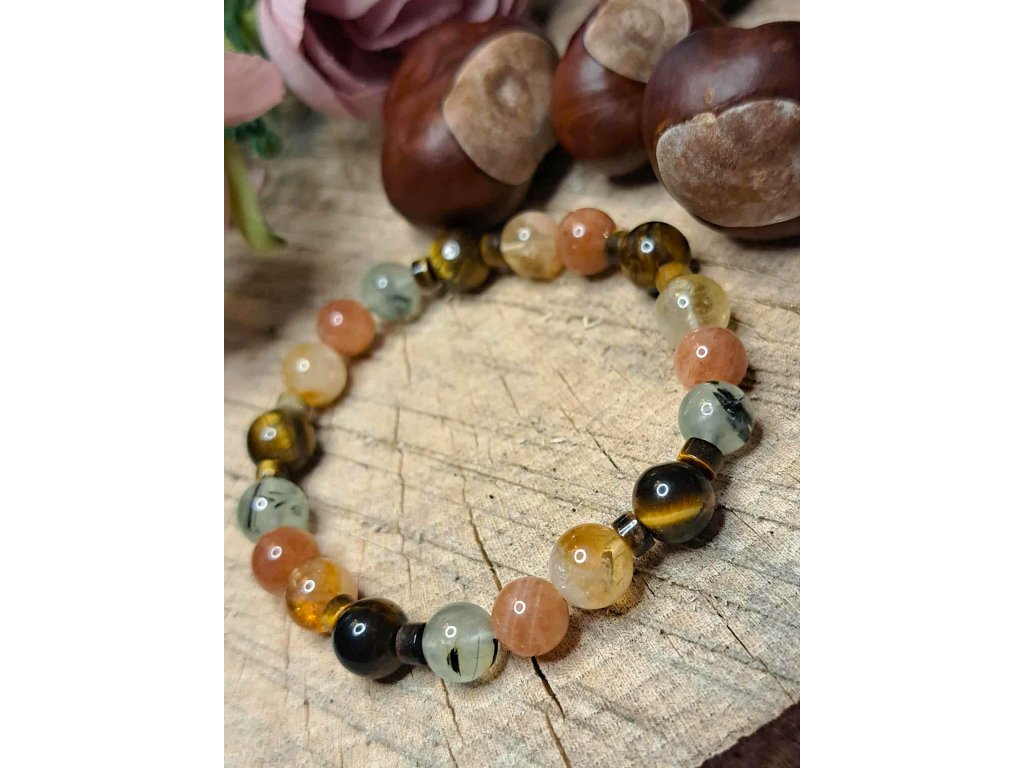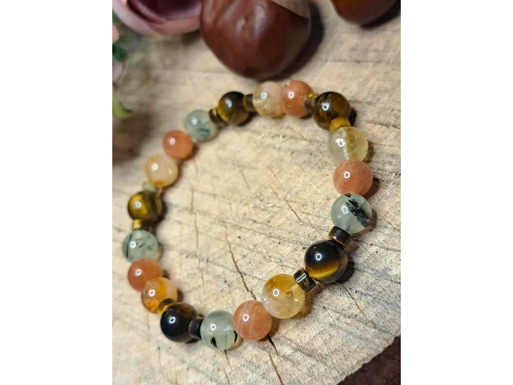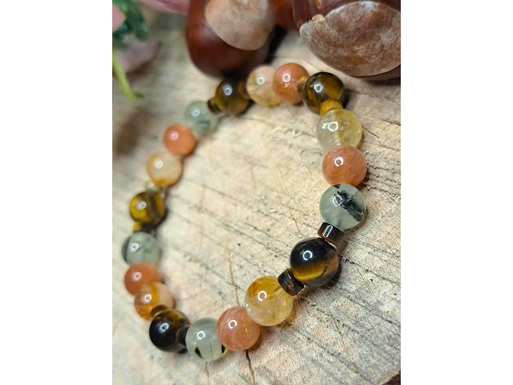 "Őszi falevelek" karkötő, prehnit epidottal, napkő, citrin AB, tigrisszem, 8 mm-es golyók, néhány szem mini tigrisszem tárcsa