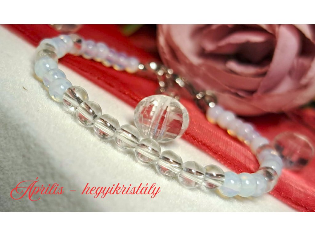 Április - Hegyikristály karkötő opálüveggel, nemesacél szerelékkel