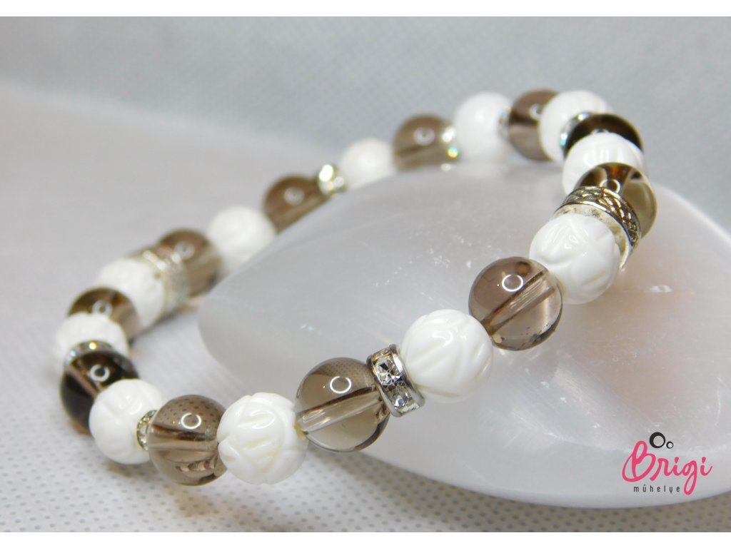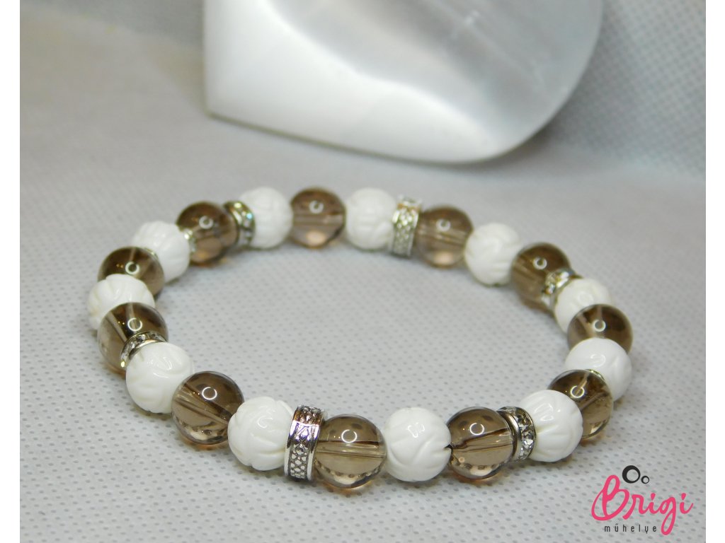 Füstkvarc lótuszfaragásos kagylóhéjgyöggyel karkötő