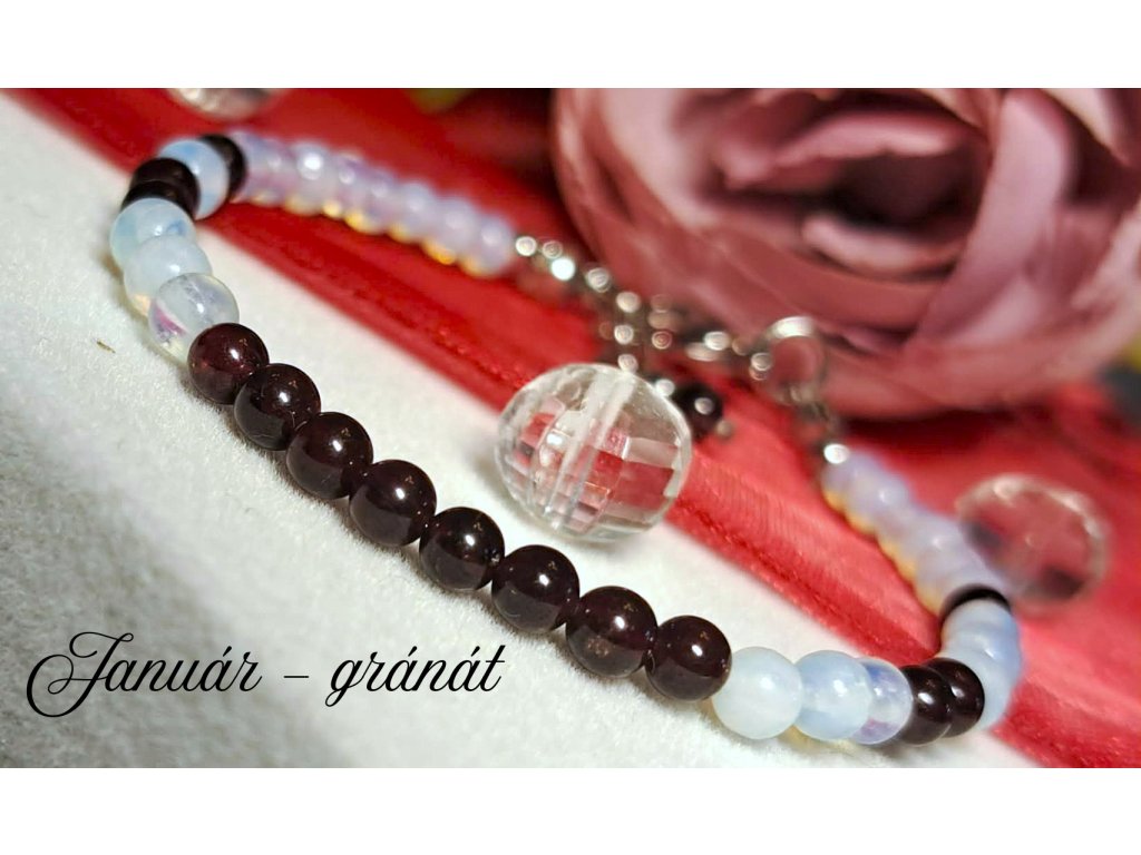 Január - Gránát karkötő opálüveggel, nemesacél szerelékkel