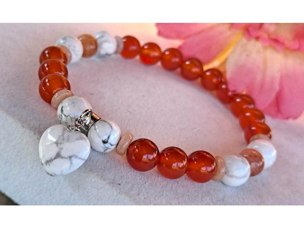 Karneol, howlit, napkő karkötő, 8 mm-es kövekből, howlit szivecske medállal