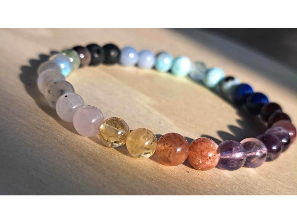 Egy szem előkelő, fazettált KÉK TOPÁZ köré sorakozik a HEMIMORFIT és a LARIMÁR, majd az ANGELIT, LÁVAKŐ, EZÜST OBSZIDIÁN, PREHNIT, LABRADORIT, HOLDKŐ, RÓZSAKVARC, CITRIN, NAPKŐ, SUPER 7, TURMALINOS KVARC, GRÁNÁT és LAZURIT.6 mm-es golyók.