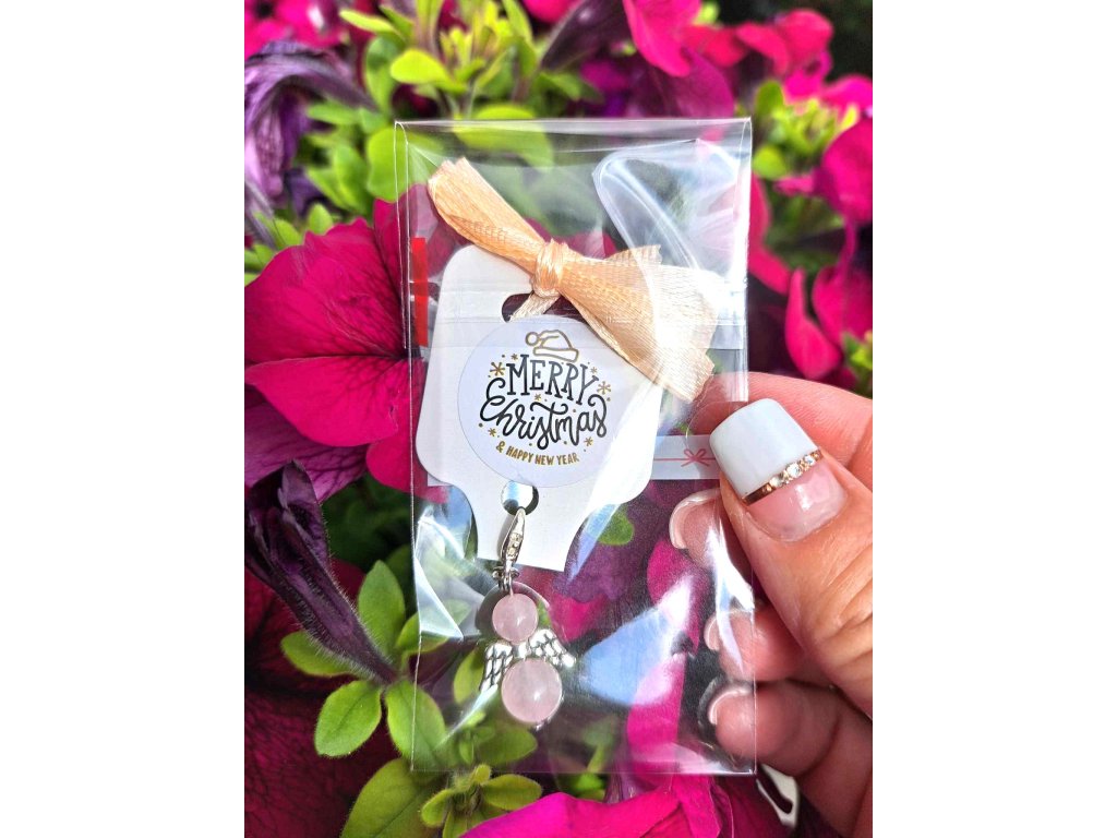 Rózsakvarc angyalka 8 és 6 mm-es ásványgolyókból, képen látható módon csomagolva