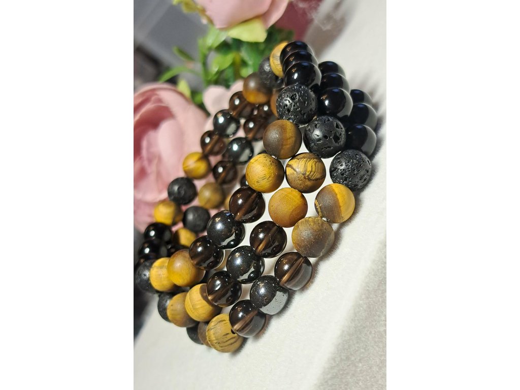 Védelmező karkötő ónix, hematit, tigrisszem, füstkvarc, lávakő